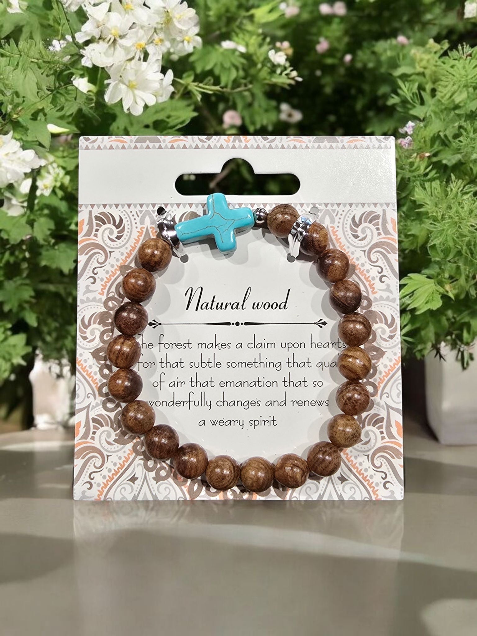 Earth meets sky in this dark wood bead bracelet, highlighted by a vibrant teal cross. Rich, warm tones contrast beautifully with the cool pop of color.